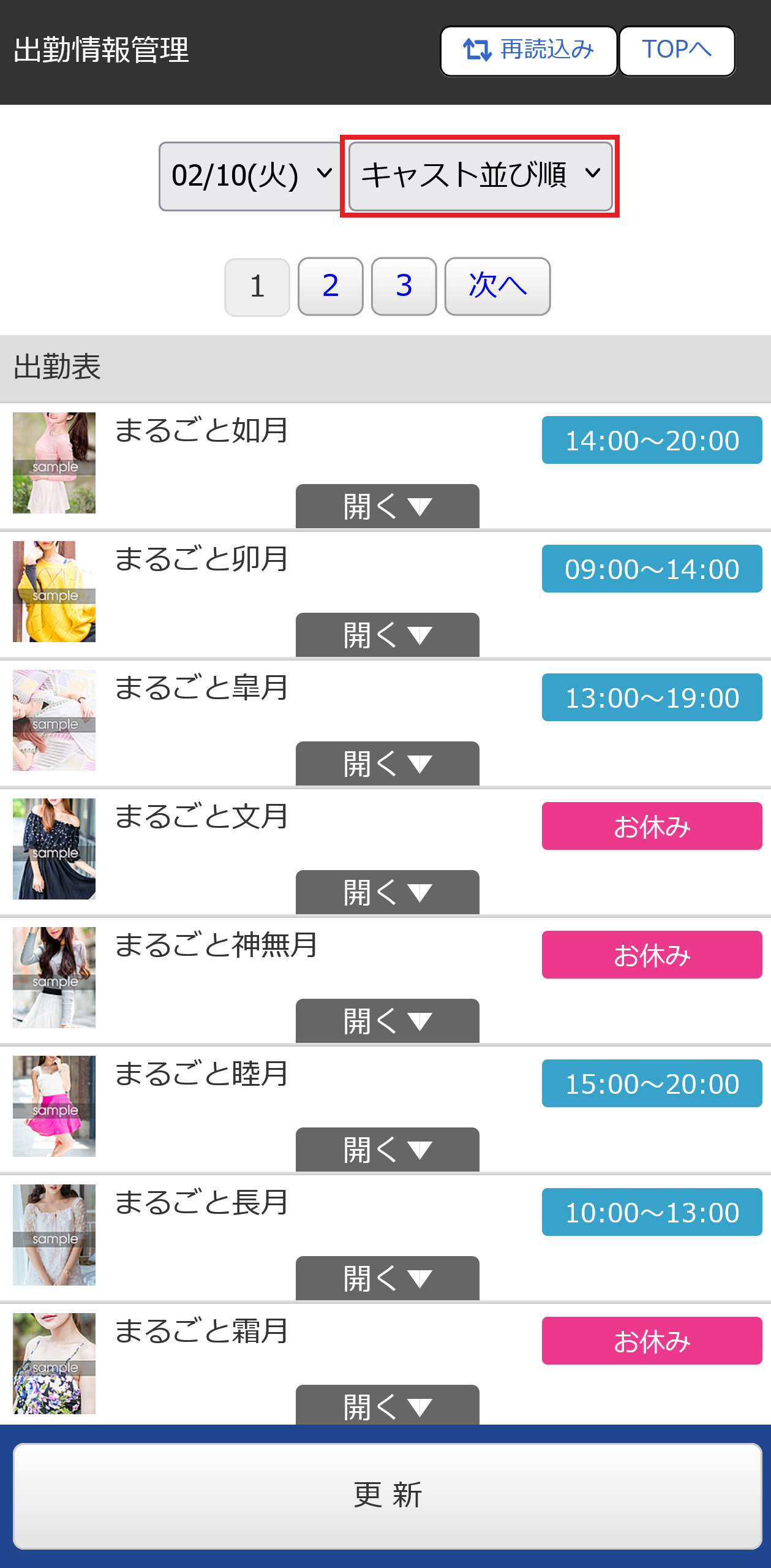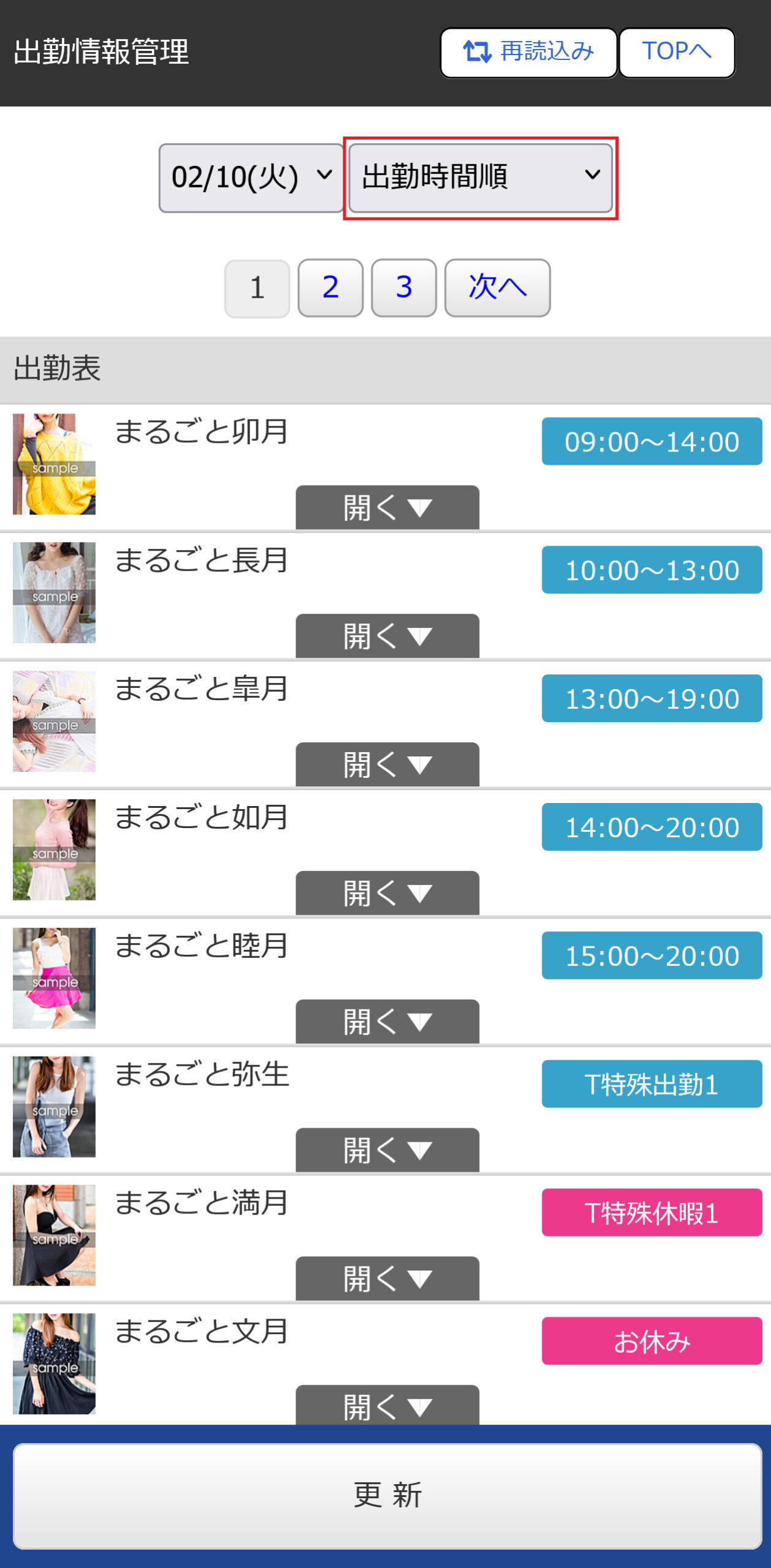スマホの店舗管理画面の出勤管理で並び順を出勤時間順にしたい。
